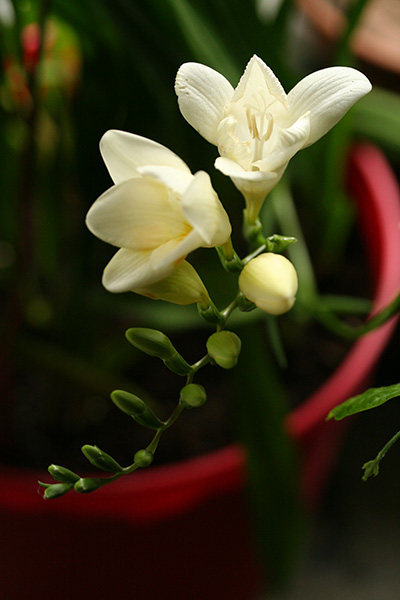 my father moved in the potted freesia plant back inside the house. i must've smelled the fragrance before i even noticed it. so far there are white and red flowers. it's hard to describe the scent, but i'm familiar with it because that's the smell of my bathroom odor spray. so for me it smells like something that comes out of a can instead of vice versa. no only regret is planting so close together in such a tiny pot. next season i'll give them a better home.
