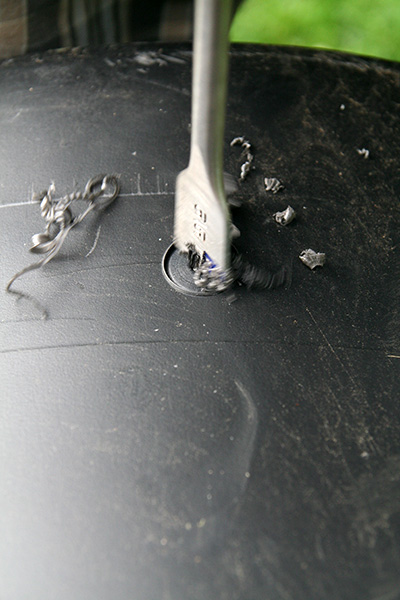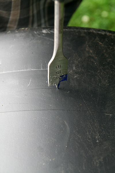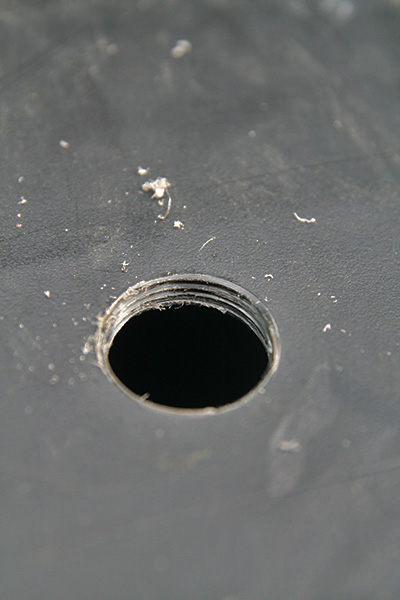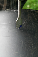 this time we had a thread tap (3/4"-14 NPT tap tool that i bought on ebay, $14 including shipping), for making threads in the 15/16" drilled hole. we didn't need a thread tap for the olive barrels because the walls were thinner, but the walls of these black plastic barrels are just too thick to put in a spigot without threading first.
