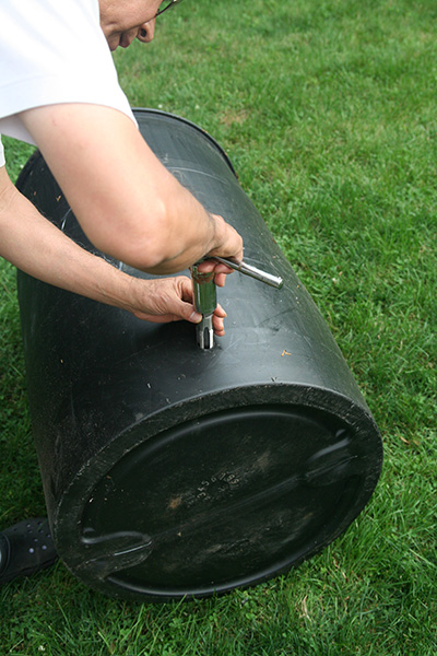 the rain barrel is only partially finished. we still need to cut a large inlet hole on the top for the rain to get inside. i was thinking we could use a mesh 4" diameter kitchen sink strainer as a cover but my father thinks that's too small.