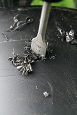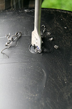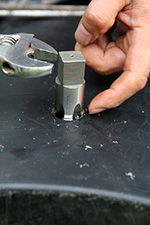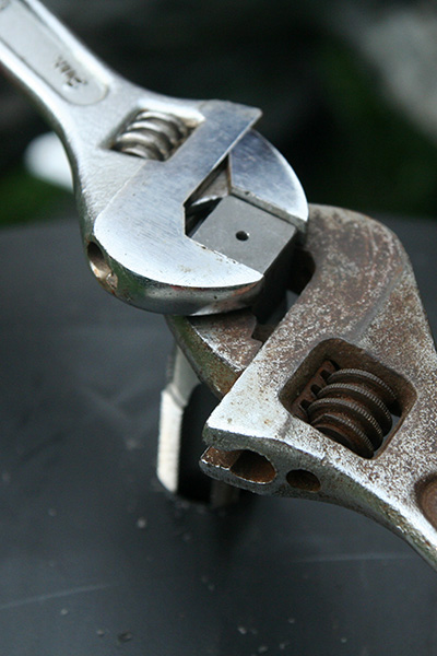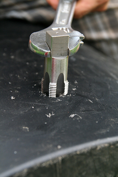at first we turned the thread tap with two wrenches for balance, but using a single wrench works too provided you make sure the tap is going in straight. tapping the hole partially creates a tight fit; tapping it all the way through creates a threading so smooth we could screw the spigot into the threaded hole with just one finger. threading makes a difference!