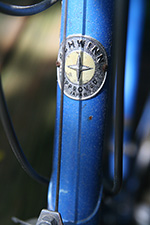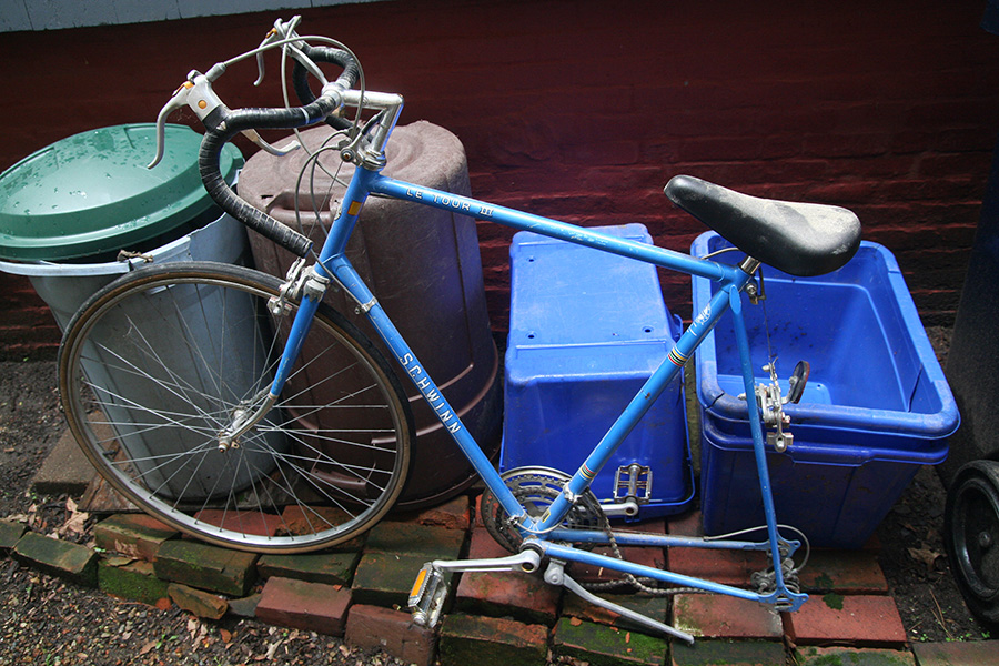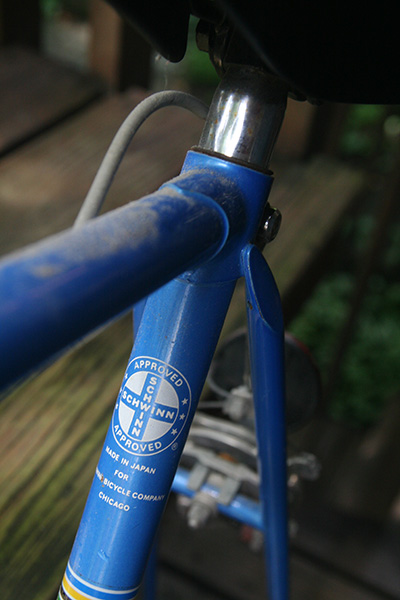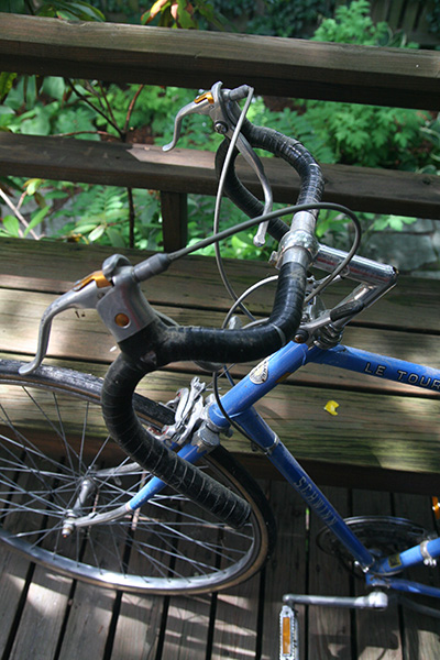 i found it this morning, tossed out by a neighbor. it's missing the rear wheel (which includes the cassette) but everything else is there. i can't believe somebody would just take the rear wheel and not the whole bike, so i'm thinking the owner must've salvaged it for parts. what's amazing about it is that it's in near mint condition, not a spec of rust on the frame (just some dust, like maybe it'd been in storage for a while). this is exactly the bike i want to own (a true road bike), but unfortunately it's too high for me (the top tube comes up to my waist). it'd make a great bike for somebody taller, provided i can get a replacement rear wheel and 5-speed cassette on the cheap.