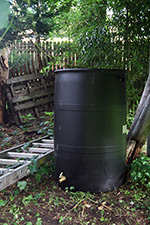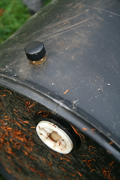 we finally drilled the 2 black plastic barrels that were lying around the yard, converting them into rain barrels.