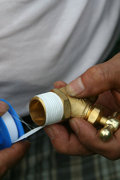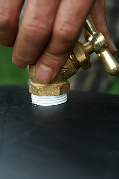 we wrapped some teflon tape around the threads of the spigot before screwing it the barrel; before we completely inserted the spigot, we also edges the hole with some clear silicone caulk for an additional sealing. later we also did the same thing for the overflow valve. my father had a spare male to male brass garden hose adapter that we used for the overflow. we put on a plastic hose cap to prevent mosquitoes from getting inside.
