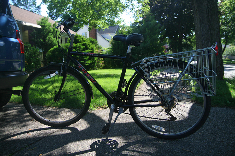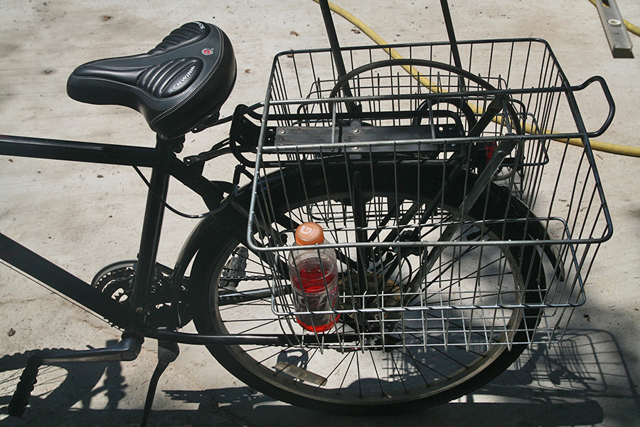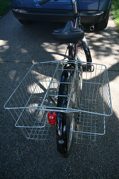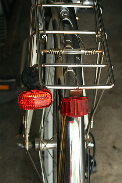 i was excited to return home, riding my newly modified bicycle. even though it was the same old bike, it felt brand new. i was most pleased about the rear light placement, now more easily seen. with my milk crate, the light bracket had a bad habit of drooping down so that cars behind me weren't seeing the light straight on.