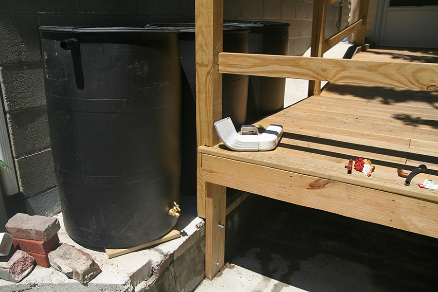 i went to my great uncle's place besides the cafe where my father was in the backyard working on a daisy-chain rain barrel setup for my great uncle. he had 3 black barrels, ready to be converted to rain catchers. since we made 2 yesterday, we had the procedures down and quickly finished off the trio. we still haven't figured out the best solution for the top inlet. what size hole should be cut? how do we set up the debris/mosquito screen?
