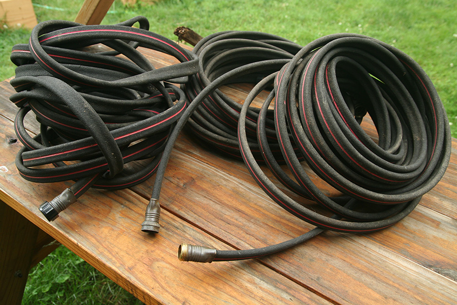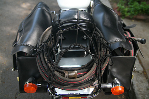 while trolling craig's list, i can across a listing for a trio of free soaker hoses on morrison avenue in davis square "on the curb." i could always use some more soaker hoses for the raised garden beds so i rode the motorcycle to investigate. as advertised, they were sprawled on the side of the road. it took me 15 minutes to coil each one (25 ft each). 2 went into the saddle bags, while the 3rd i had to coil around the sissy bar and hold in place with a bungie netting.