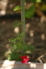 there is a 3rd zucchini on the large squash plant. its flower has yet to bloom, so the bud looks like a turban on the zucchini. we have a lot of sunflowers this year; i didn't realize they would all germinate when i planted them in the spring. there are actually so many that it's eclipsing the cocozelle squashes and the pickling cucumbers growing below. i'm hoping the sunflowers will bloom within in the next week or two and we can cut them down to allow more sun to pass through. finally, one of the cypress vines has finally bloomed. they're so delicate and always seem to be overshadowed by distant cousins morning glories and moonflowers. the moonflowers have yet to bloom. i don't think we'll see any until august.