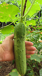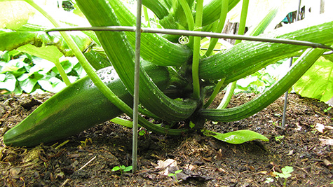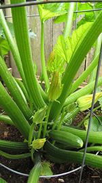 having never grown zucchinis before, i'm not sure when to harvest them, but the big one that's growing now seems ready to be picked. it's kind of tapered at the far end, maybe i'll wait until it fills out a little bit more. i'm more of a cucumber man myself; zucchini taste mushy to me, almost like an eggplant (which i tolerate, but only if masked in other flavors so i can ignore the unappetizing texture); cucumbers are crisp, which taste better.