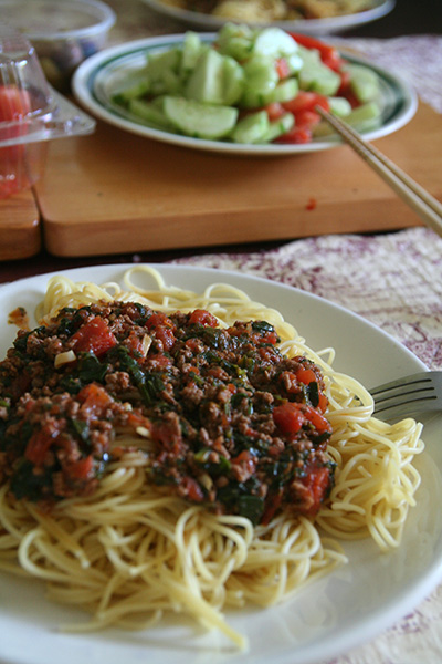 dinner came in the form of spaghetti, the meat sauce made using leftover ground beef from the blue cheese burgers i rolled last weekend. we also ate one of the garden cucumbers, amazingly crispy, although a bit bitter near the stem end for some reason.