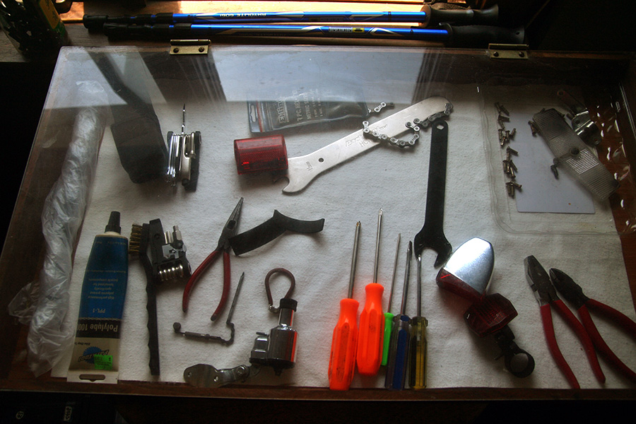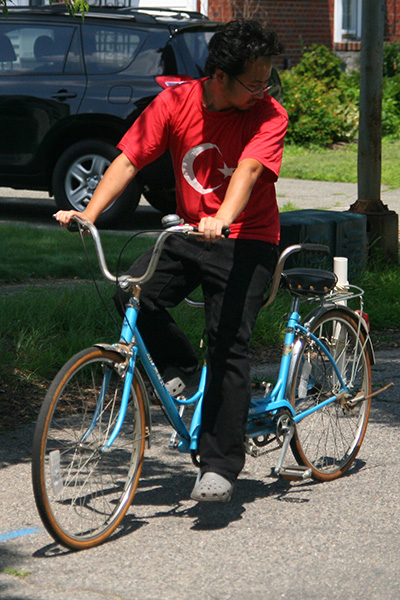 my father pulled down the tandem bike hanging from the wall of the garage so he could work on it. maybe i'm used to pulling a lot o weigh when i ride, but when i rode the tandem single, i couldn't tell the difference from a regular bike. it certainly didn't feel heavier, or an evidence of increased fishtailing because of the much longer frame. i've always considered tandem bikes sort of gimmicky. i rather have 2 people each have their own bikes instead of sharing one bike with another person. in fact, i've fallen off the tandem before, crashed to the ground with my friend toby when we were kids. somewhere on my body i probably still have a scar or two from that accident, which just happened a few houses down.