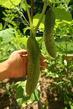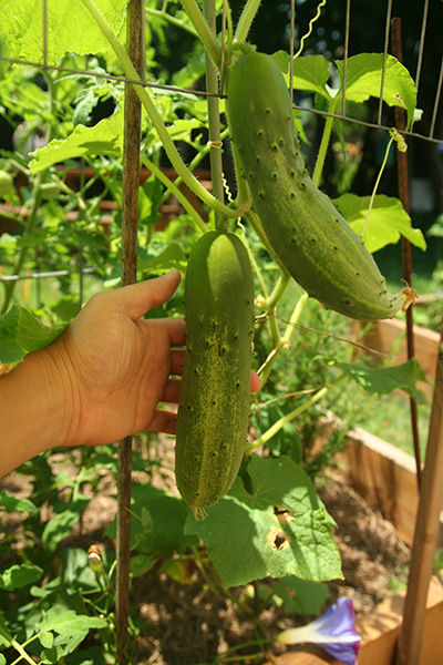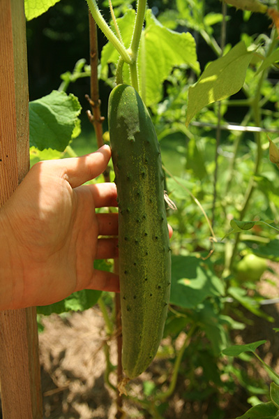 there's no short supply of cucumbers though: 5 hang from the vines, waiting to be taken. here's a question: are these 2011 cucumbers like the 2010 cucumbers? it's sort of hard to say. it's definitely different from your typical cucumber in its molted patterning, but not like last season's batch where we also got yellow and orange varieties. tastewise they're very much like regular cucumbers, and i'd go as far as to say they're even crisper, but maybe it's just because they're so fresh.