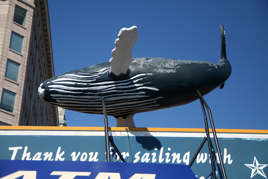 i made very good time and arrived at the aquarium MBTA stop by 9:20. i parked my bike by the nearby bike lock and made my way to the pier. since i had more than half an hour before departure, i was just wandering around, standing in shade to stay cool. that's when it hit me: maybe i should try to board the boat early, so i could get a good position. by the time i made that realization and made my way to gate 4, there was already a long line of whalewatchers waiting to board. next time, get in line early!
