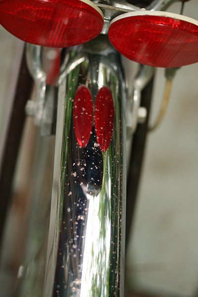 i gave the bike a more thorough inspection once i was home. i like the double rear reflectors, it's something i've only seen on ross bikes. the seat looks nice, but it's really lumpy and i could feel the springs hitting my butt. one area of concern was the front wheel, the chrome finish had flaked off on the sidewall. not sure how this could happen unless this was a very cheap wheel.