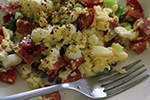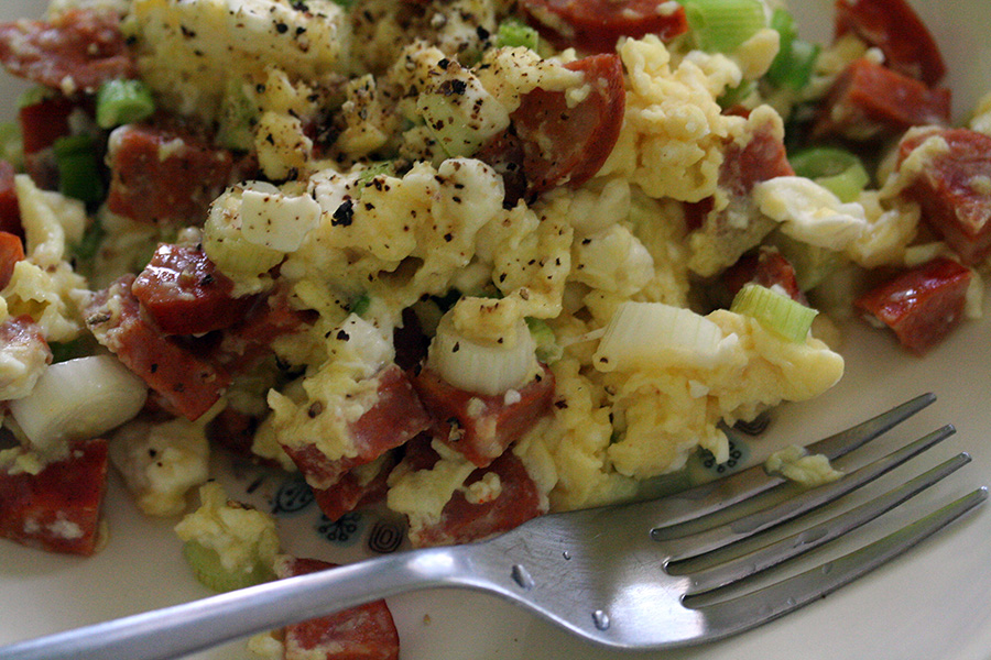 i made some scrambled eggs with scallions and feta cheese and chorizo. originally it was supposed to be an omelette but i thought it'd be easier if i just mixed everything up. this was feta cheese that i accidentally bought back in april, and had been sitting in my parents' fridge for the past 3 months. it'd never been opened but was way past the expiration date. it looked okay though, no molds, and tasted fine. i washed it all down with a smoothie that had the additional ingredient of leftover garden raspberries.