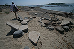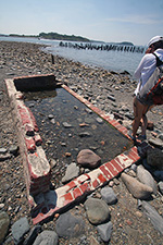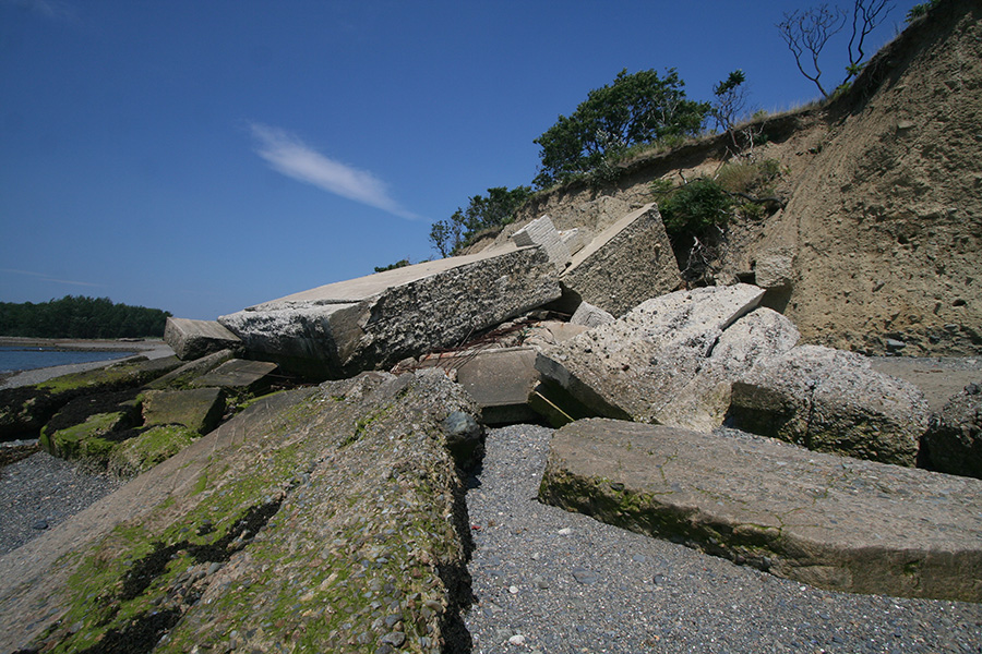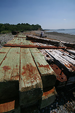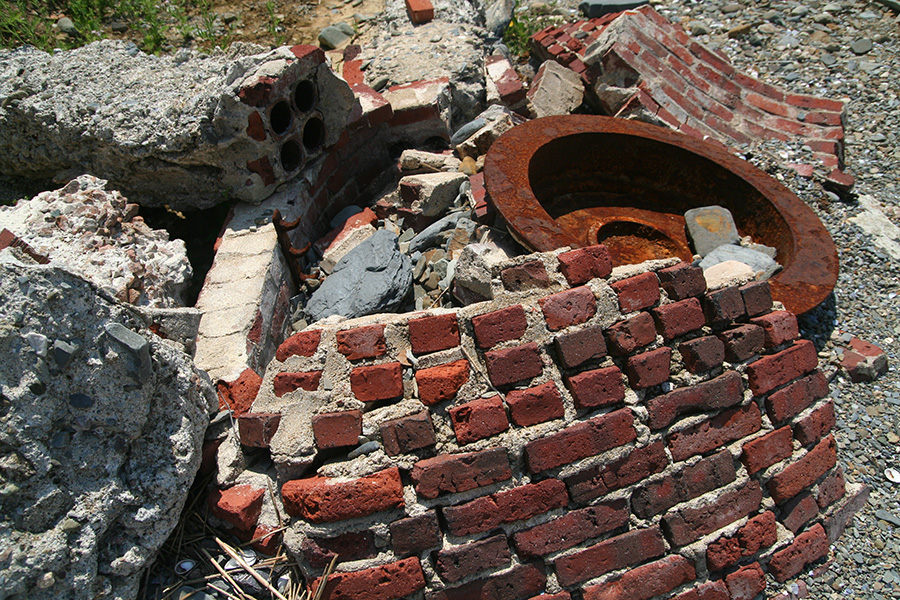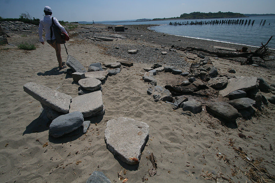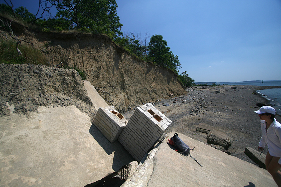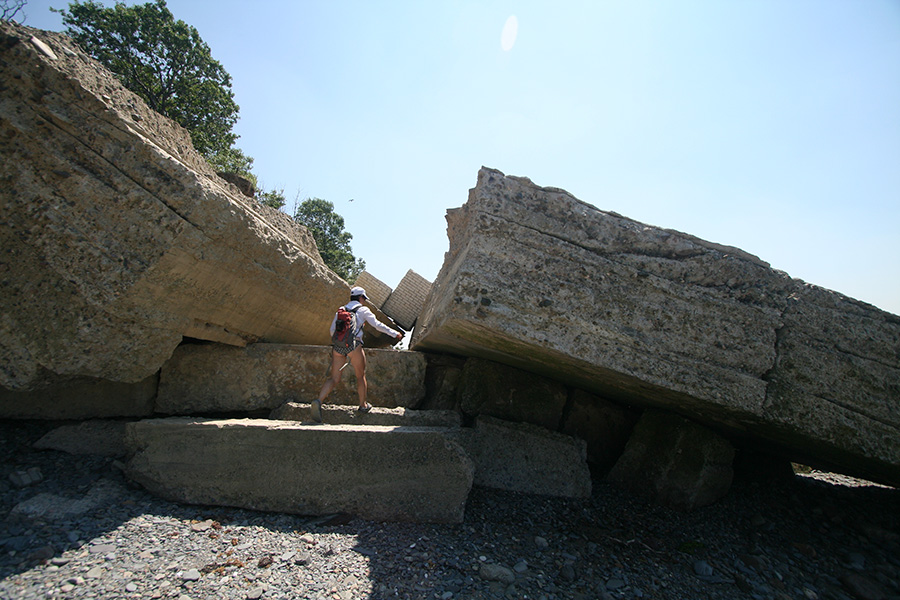 further down, the disintegrating debris along the shore were remnants of a WWI compound. this area was also close to the island campgrounds and we found evidence of campers building makeshift structures like a set of beach chairs made from broken pieces of concrete walls.