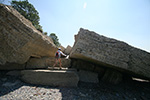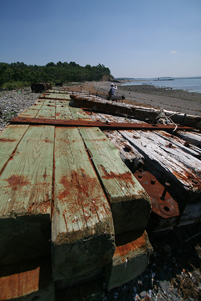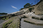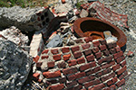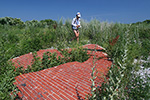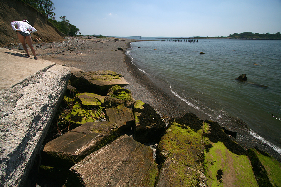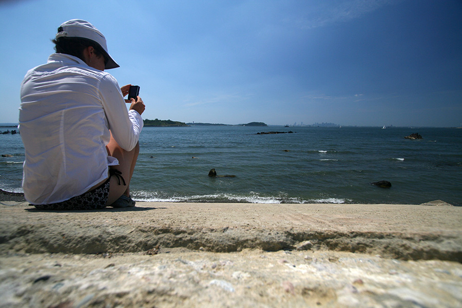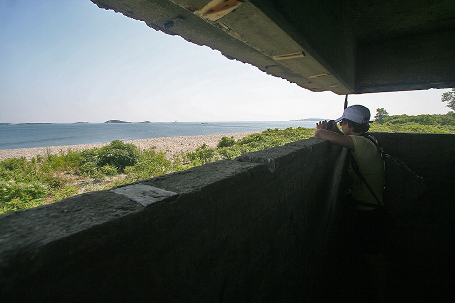 continuing down the western coast, we found broken pieces of a former pier, thick pieces of wood still well preserved. eventually our path was blocked by what looked to be the collapsed remnants of a very large structure. the only way to get across was to climb over it. this was the protected switchboard room, built in the 1920's. it caved in recently (within a few years ago) since the island brochure still warns visitors about not going inside. in its current crumbled condition there is no interior anymore. it was a nice place to sit and view boston across the harbor.