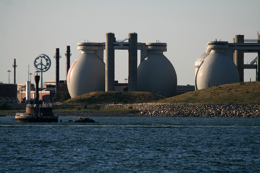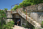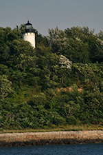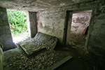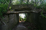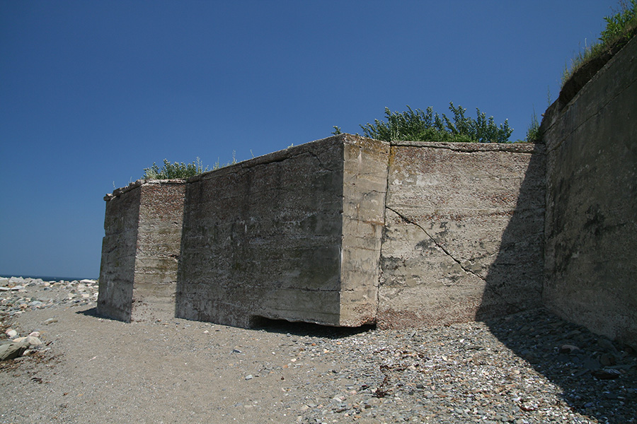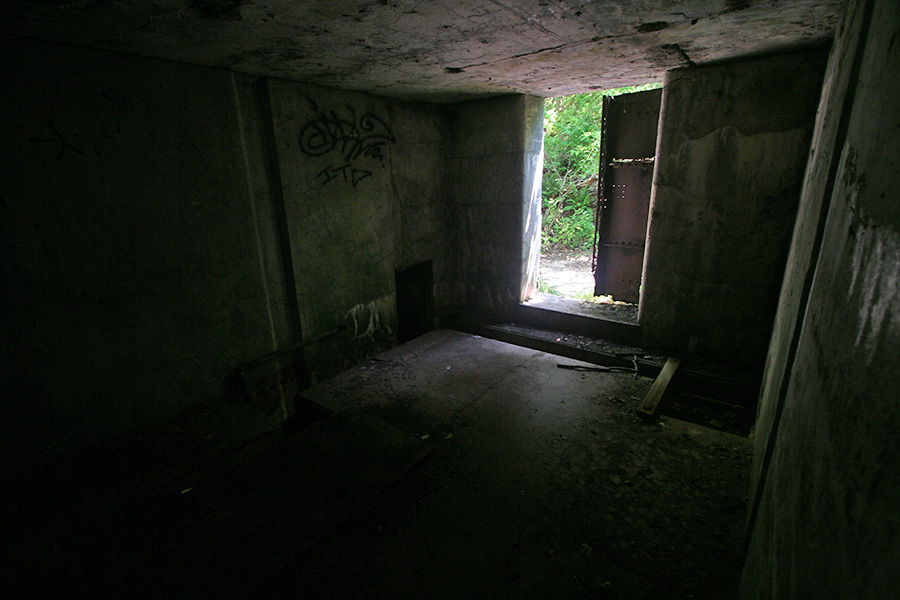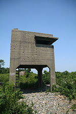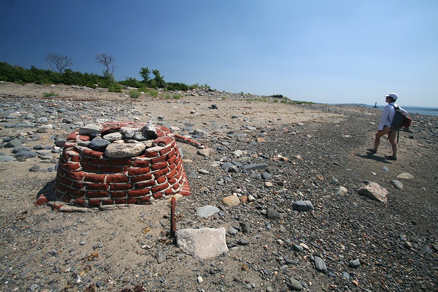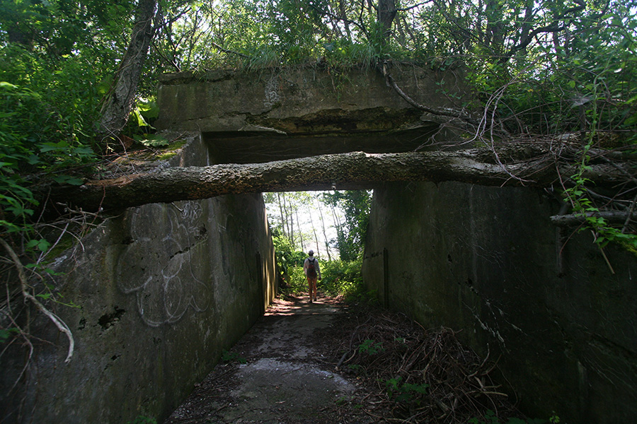 coming around the northern bend counterclockwise, we came across a large fortified structure. knowing a little history of the islands, i recognized it as part of a defensive gun stand. we tried climbing it but couldn't find enough footholds. we went around to take a look inside. further back were the former oil house and range light station (1903).