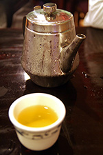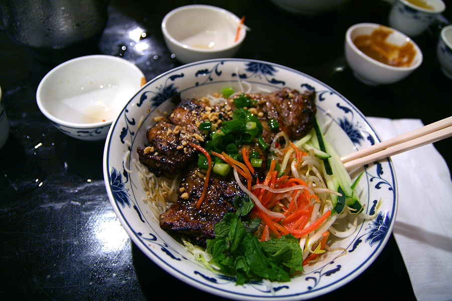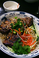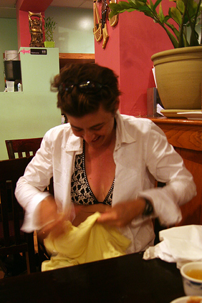 they served cold tea at the restaurant (real cold tea, not code word for underaged dim sum beer) which we drank like it was most delicious drink in the world. i flipped the teapot lid for seconds. be both got the grilled chicken vermicelli bun with spring rolls for an appetizer. the waiter came out with our rolls as well as a peanut dipping sauce and 2 bowls of fish sauce. we dipped in both until we realized the fish sauce is actually for the grilled chicken. julie couldn't help getting the peanut sauce on her white shirt and finally decided to take it off. the bathroom was occupied so she quickly changed into a t-shirt at the table, scandalously flashing her bikini top.