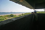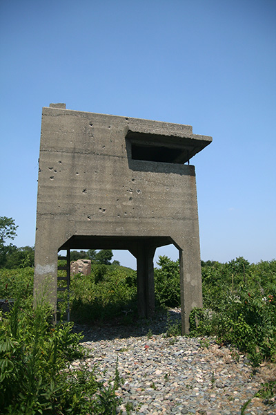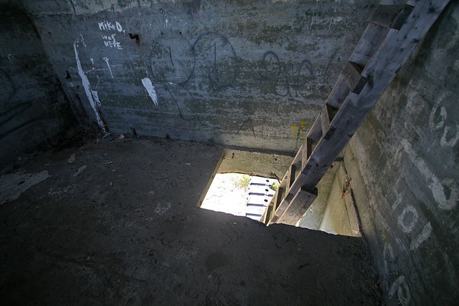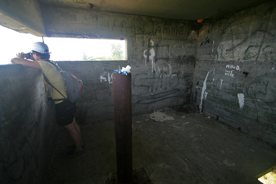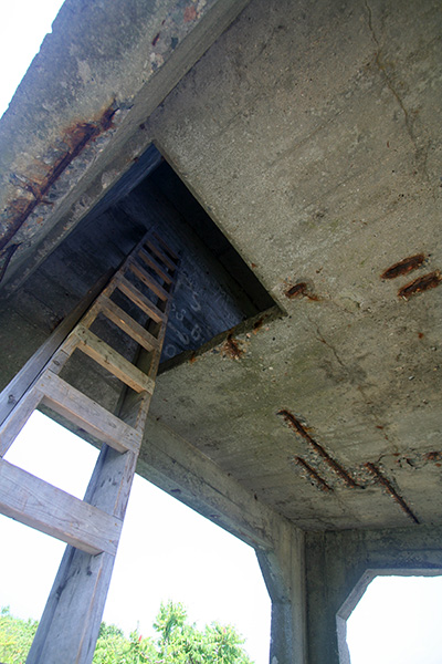 the first structure we came across was an abandoned concrete watchtower. i climbed the wooden ladder up into the observation deck. the interior was covered in graffiti and smelled of urine. the tower wasn't very high, 2 stories at the most, with a view of the nearby beach on the other side of the island.