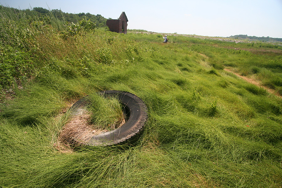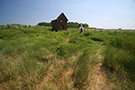 we took a short trail through the forest and came out onto an open field of tall grasses, like a sea of swirly greens. there was a little building in the middle of the field, slowly falling apart, its back wall having toppled recently.