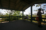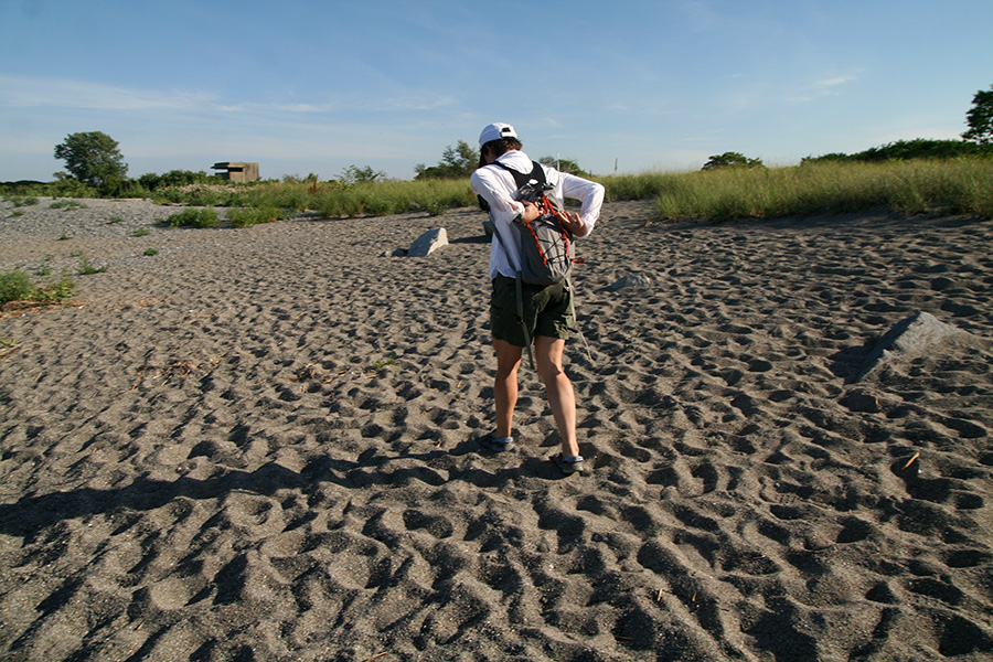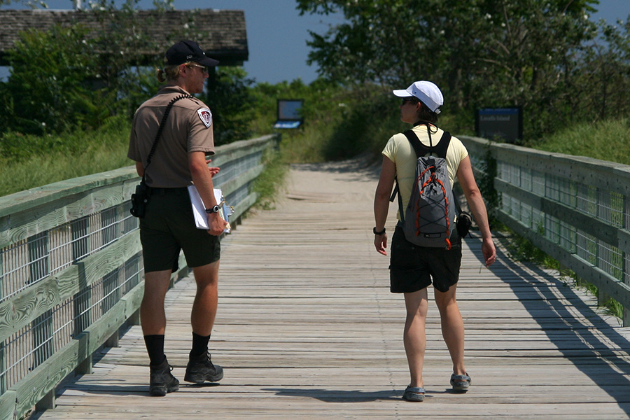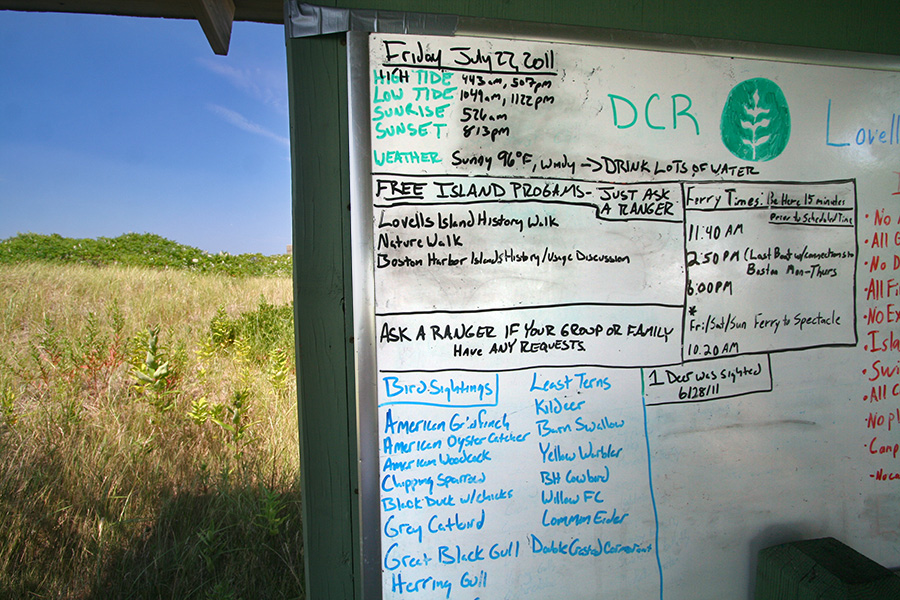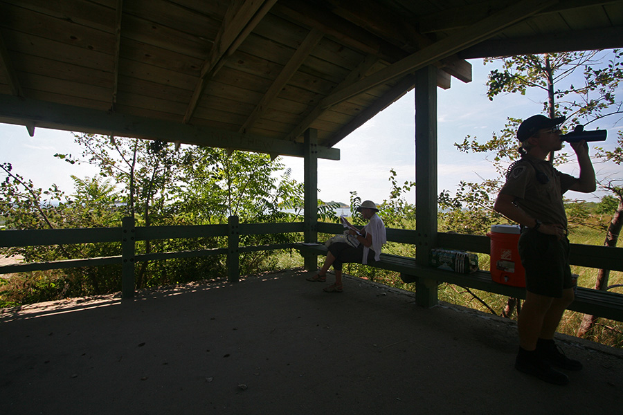 there wasn't anybody else around except a small group of people on the beach landing from a boat. the ranger led us to the information pavilion where he gave us a quick talk about the island. last ferry is at 6:05. drink plenty of water (more here if you need it). stay away from the southeastern end of the island because of nesting terns.