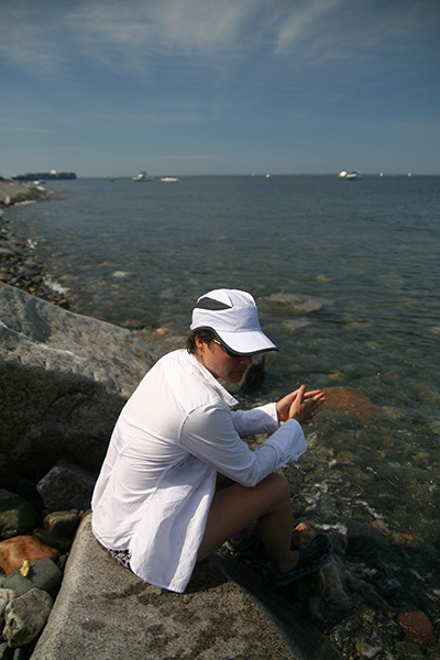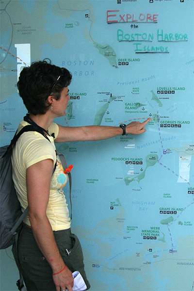 julie jumped in with her clothes on to cool off. i kept my distance, preferring to keep my camera equipment dry. wide gravel trails went up to 2 different summits. since we only had time to do one, we went to the higher hill. it's a fairly new island, the vegetation reflects this as there aren't any large trees (sumacs, some pines). it's one of the harbor islands closest to boston, so it gave us a pretty good view of the city. there was a pavilion on the summit with a cooler full of ice water left there courtesy of the rangers.