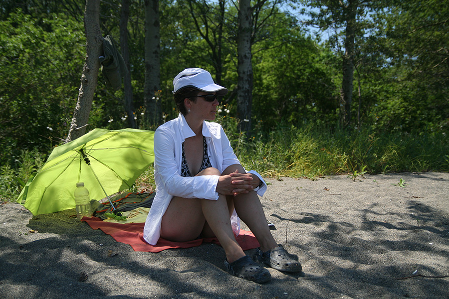 we used the low-hanging branches as hooks for our clothes. julie brought a towel to sit on while i just sat in the sand. she shared some fig newtons with me before we went back into the water again. we rested back under the shade. the only nuisance were biting black flies, impossible to hit, incredibly persistent, and seemingly immune to bug repellent.