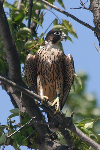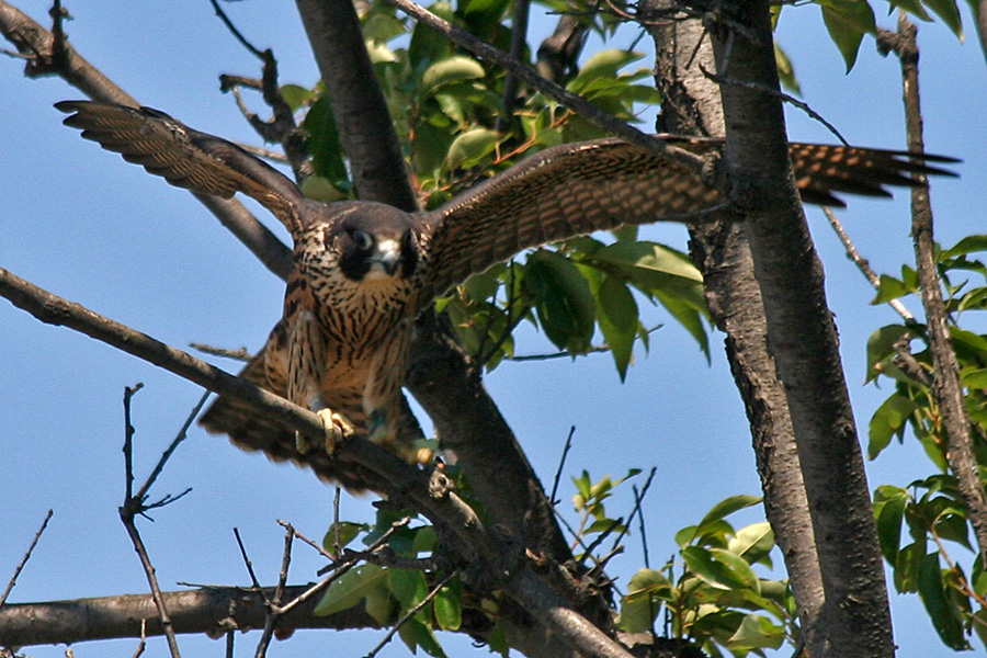 a nearby bird flew from tree to tree. at first i thought it was just a seagull before i got a better look. a kestrel! but too large. could it be...a peregrine falcon? it finally stopped on a branch, panting from the heat. i thought peregrine falcons were endangered and rare but later i discovered they're actually quite common. i'd never seen one before.