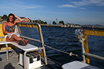 having learned our lesson, we were down by the pier at 11:30 for the 11:45 ferry. there would be no mistakes this time. the ferry boat was crewed by two giggly teenagers, a boy and a girl, foregoing the garish hawaiian shirts for nautical captain shirts one of them purchased on ebay. it made me a little nervous that we were being transported by kids, but it wasn't like you needed to be a rocket scientist to pilot one of those things.