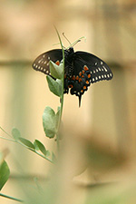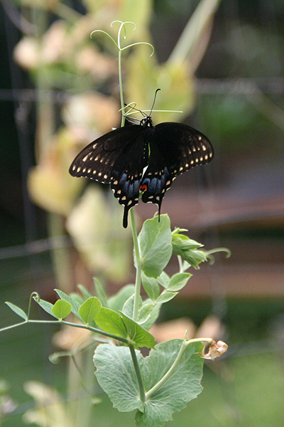 we had some insect visitors in the garden. a female black swallowtail was fluttering around in the backyard (females have more blue; males more yellow). i had my camera but the wrong lens so wasn't able to get a close shot. by the time i went back inside to grab my telephoto and macro lenses, it flew away. maybe it was attracted to the garden because of the carrots (its caterpillars also feed on dill and parsley but we're not growing enough of it). i'll keep my eyes open for eggs and possible caterpillars.
