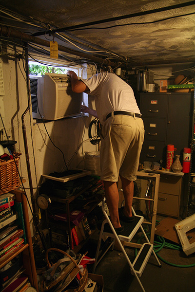 my father was busy installing an air conditioner in the basement. we have as many as 3 dehumidifiers running downstairs to keep out the moisture. the problem with dehumidifiers is they heat up, so during the summer on particularly humid days the basement can get sort of warm. that's when father figured we could dehumidify the basement with a window-mounted air conditioner. since the AC exhausts to the outside, it could keep the basement dry while not warming it up. he came across a fairly new 5000 BTU unit. after installation, we're still waiting to see if it'll actually work (or whether we might need a bigger AC, or put it elsewhere in the basement).