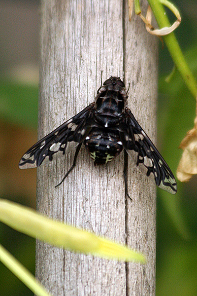 i also spotted a tiger bee fly. they're kind of scary looking because they look like a giant fly with checkered black and white patterns. they're harmless though, unless you're a carpenter bee: the larvae feed on carpenter bee eggs. i used to hate tiger bee flies because of what they do to carpenter bees, but now i like them after seeing the numerous bee holes found on wooden posts in the backyard.