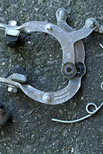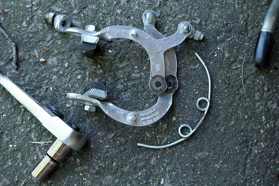 i went ahead and replaced the frayed front brake cable from the ross 3-speed. my father came home right when i was about to tighten up everything. everything was gone great until we tried to center the front caliper brake by tightening the rear bolt. a few inopportune turns of the socket wrench and i managed to shear the centering bolt in half. i swear, that ross 3-speed is cursed. every time we fix something, we end up breaking something else. trying to fix the shifter and we brake the bell crank on the 3-speed hub. replacing a brake cable and i snap a bolt in half. we're close though. i'm going to try and salvage the front brake from the rusty raleigh in my basement, but i'll also visit the bike shop to see if it wouldn't be better just to buy a set of replacement caliper brake, maybe one that centers better. they're not very expensive, less than $10.