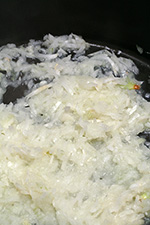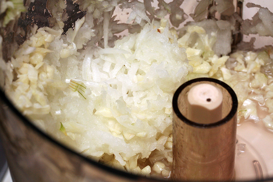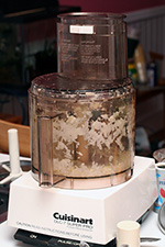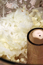 besides the onions, i also grated a handful of garlic. the final result was a very fine grated onion and garlic medley, with a surprising amount of liquid. the 14-cup processing container is just too big and the motor is simply an overkill for the kind of cooking i do. the base is also obscenely heavy, and the whole unit jumps a bit on the counter when i first turn it on, but once the blade is running, it's very stable and runs almost silently.