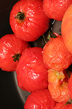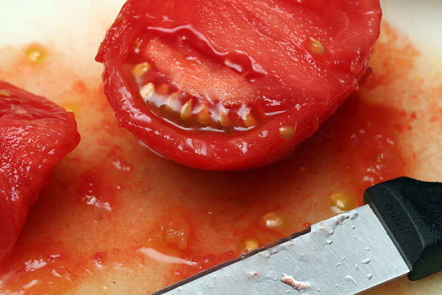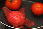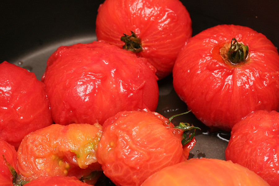 i cut x-marks at the bottom of each tomato and boiled them briefly before dipping them in a cold water bath. the skin came off effortlessly and i was left with 10 flayed tomatoes.