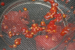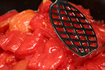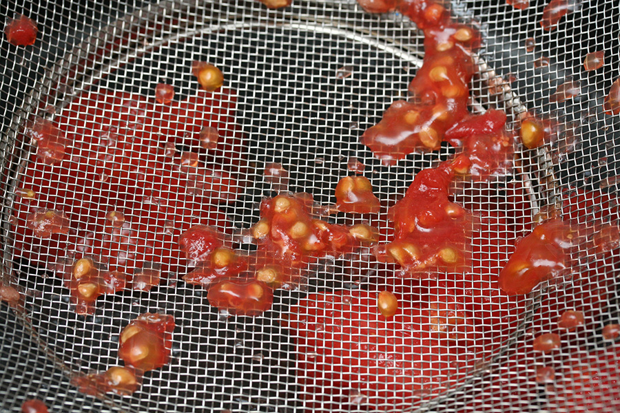 next came the seeding. i quartered the skinless tomatoes and scooped out the guts inside into a strainer that separated out the seeds from the juices. the tomato flesh i threw underneath into a pot. i then mashed up the tomatoes to help in the reduction. i chopped up some garden basil, more than a cup's worth. i also found a single red cayenne pepper which i also chopped up for the sauce.