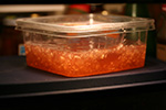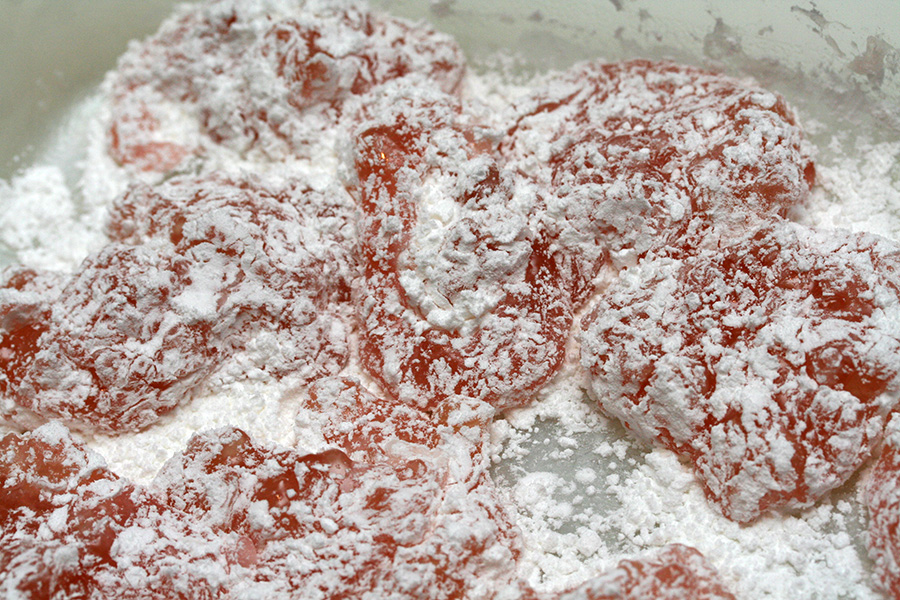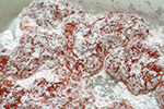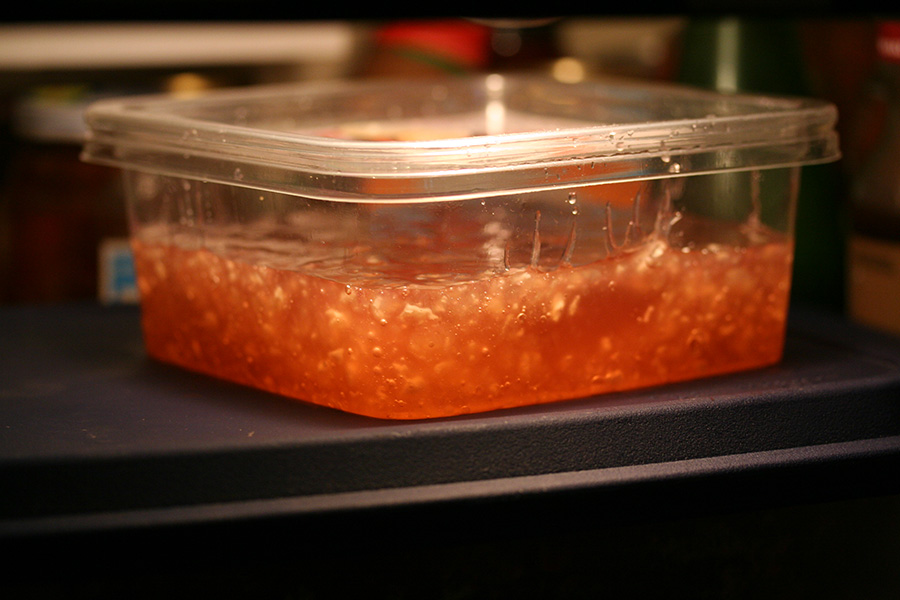 when i pulled my turkish delight from the fridge it looked solid enough, but as soon as i plopped it onto the large cutting board (i had to pull it off the plastic wrap like a fruit roll-up because it was so sticky) i saw it was still liquid. a slow oozing liquid, but liquid nonetheless. it seemed to expand on the board, growing larger and flatter. i cut a few sticky pieces and plopped them into a bowl of powdered sugar and corn starch mixture. it tasted okay but was super sweet. it was also very lumpy inside from all the starch pellets, more than i realized. the few powdered pieces i made, they would slowly loose their shape and also start sweeting and soaking up the white powder. this was a lost cause, the result was failure. i thought about maybe reboiling the mixture, but the problem is the corn starch never really congealed and no amount of heating would be able to fix it. i scraped off the mixture from the board and dumped it in a leftover plastic container. now sure what i'm going to do with it but i'll probably throw it away and start over.