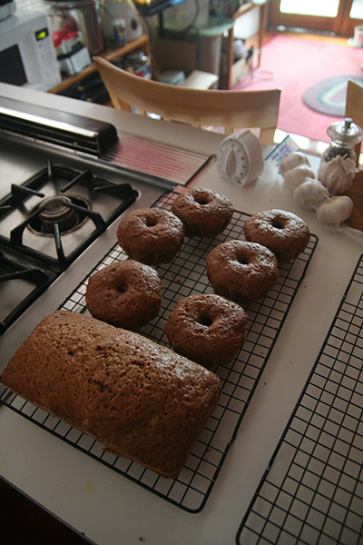 the recipe would make 2 8x4" loaves of bread, but i only had one loaf pan. the other half i pour into small half dozen bundt cake molds. my parents gave them to me when i first moved into my place. i like them better than muffin tins because i can get more crust. into the oven they went, baking at 325°F for 70 minutes. by then it was 10:15. the house smelled like heaven (scent of cinnamon and baking) and i was getting hungry, but saving myself for the zucchini bread.
