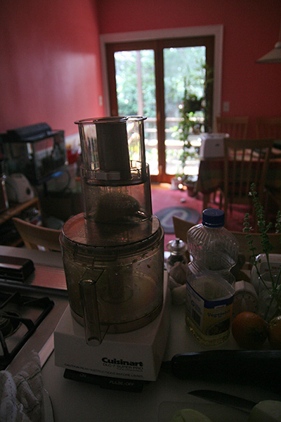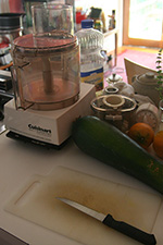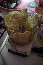 i started by slicing the zucchini in half and using the food processor with the special attachment blade to shred the zucchini. i didn't know whether or not i should keep the skin so i cleaned it up with a peeler. the food processor made quick work out of the zucchini half, reducing it all to nice long strands that looked like pasta noodles. even though it was only half a zucchini, it still managed to produce 5-6 cups of shreds. i only needed 2 cups; the rest i put away in a container, to be used another time (or thrown away when it goes bad).
