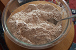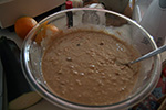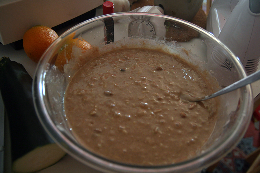 the recipe calls for mixing the dry ingredients and wet ingredients separately before combining the two. for the dry: 3 cups of flour, 3 tsp cinnamon, 1 tsp baking soda, 1/4 tsp baking powder, 1 tsp salt, 1/2 cups chopped walnuts. why it asked for both baking powder and baking soda i have no idea. i even looked it up online and still not quite sure what the difference is. as for the wet: i beat 3 eggs with a mixer, then beat in 1 cup of vegetable oil and 2 cups of sugar. i had just enough sugar for 2 cups, but only enough vegetable oil for 1/2. i have really old vegetable/canola oil that expired in 2008 so i figured it was most likely rancid. i ended up using 1/2 cup of olive oil that i had lying around. next came 2 tsp of vanilla extract and the 2 cups of shredded zucchini. i mixed the zucchini with a spoon because i didn't want to mash then up. i then pour in the dry mixture and mixed everything until it had an even consistency.