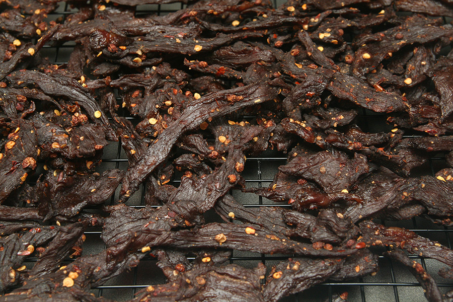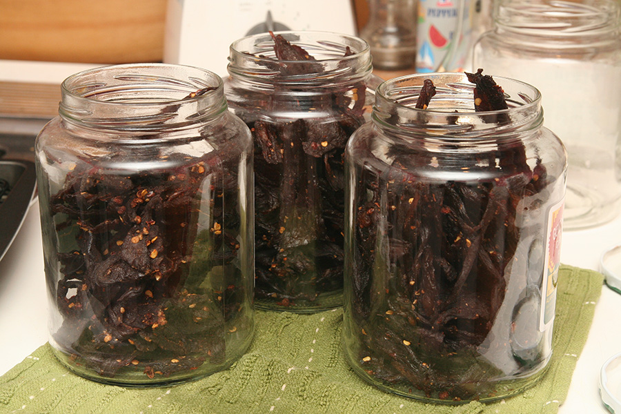 i ended up with 3 jars of beef jerky. i couldn't really taste the additional honey, and i might've added too much sichuan pepper corns. the thicker worcestershire sauce didn't hurt the final result, just made the towel-drying phase a little longer. next time i really ought to try a different recipe, since i make the same sort of jerky all the time. but if a recipe works and people like it, why change?