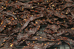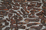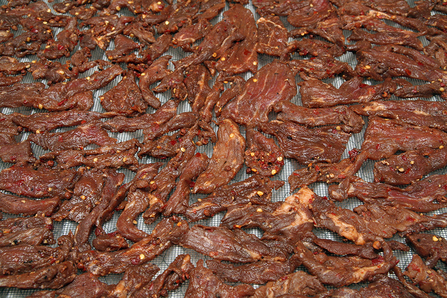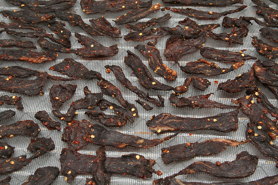 i finally stopped the fan by 10:00 after nearly 12 hours of dehydrating. maybe it was the dry summer weather, or the fan speed set on high, or a combination of both, but the jerky was dried to perfection, and didn't need to be baked in the oven. however i baked it at 180° for about an hour just to render off some of the dried fat and also as a safety precaution to kill any remaining microbes (though i don't think anything could've survived 12 hours of high speed drying).