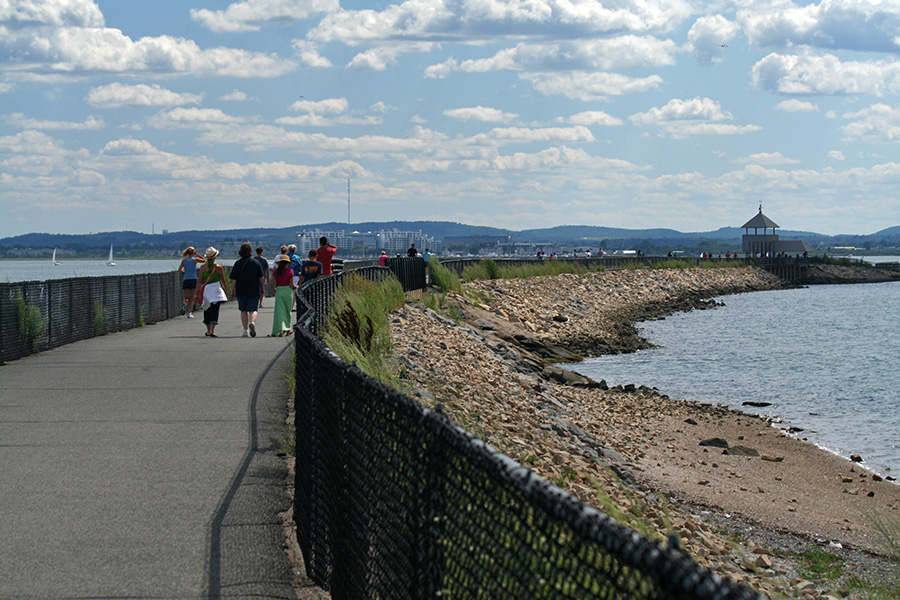 castle island was crowded: a lot of seniors, a lot of children, a lot of joggers. the nearby parking lot was full, but there was still plenty of free curbside parking down the stretch of beachfront shoreline. the name hints that the place was an island at some point, before a large cargo dock was built that linked it to the mainland. castle island is dominated by the "castle" of fort independence, a pentagon-shaped fortress that's only opened to the public on certain special days and for guided tours. castle island sits next to pleasure bay, a circular body of water that you can walk all the way around. inner bay is a beach, while kids take boating classes in the protected waters. another notable feature: since logan airport sits directly north, planes are constantly flying overhead (just like at deer island).