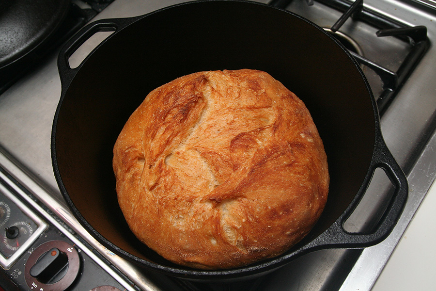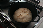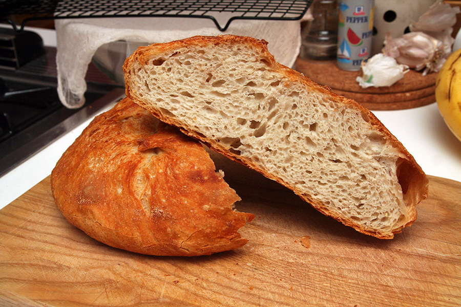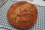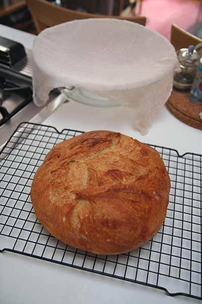 the bread had been baking for 45 minutes when i took it out of the oven and removed the lid for an additional 15 minutes of browning baking. the final bread looked pretty good. about the same size as the bread i made on tuesday, maybe even a little bitter. it didn't have that large burst-at-the-seams fissure of tuesday's bread, but it did have a few minor fissures. while cooling on the rack, i could hear the crust cracking. the bread had a thin crust, with a very soft middle. another success!