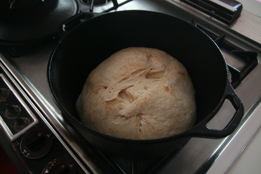 at 2:00 i checked the dough, which had ballooned during the 2nd rise. i turned on the oven and after 30 minutes of preheating i dumped the dough into the cast iron pot. it was hard to drop the dough into the 450° cast iron pot from the cheesecloth while still making sure it was centered, so i ended up just plopping everything into the pot and peeling off the cheesecloth. that seemed to work pretty well. i saw the folded edges of the dough was already coming apart. hope that's okay. into the oven went the bread to be baked for 30 minutes.