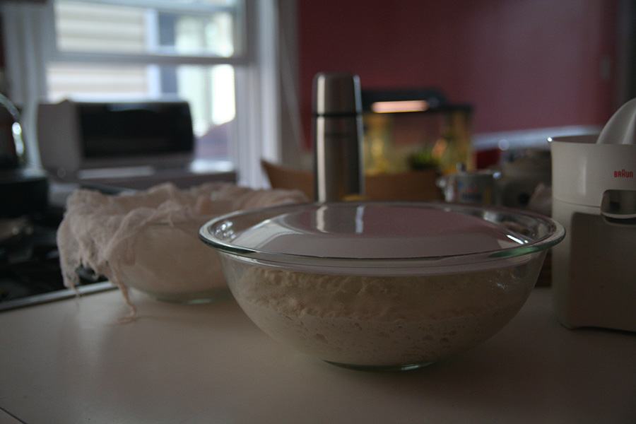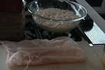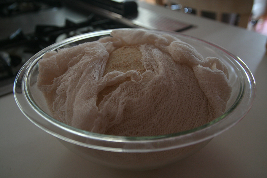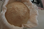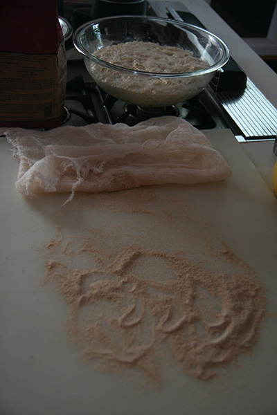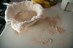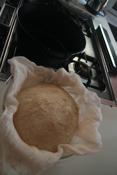 around noontime i peeled the 12+ hours fermented dough from the pyrex bowl and prepared to flour and fold the thing for the 2nd rise. i was amazed by how much it transformed overnight, because when i first mixed up the dough it wasn't very impressive-looking. since that time it'd expanded in size to almost fill the entire bowl. i used a cheesecloth this time because the dough doesn't stick to it like the cotton towels. you can't really dust a cheesecloth with flour because it just goes right through. i did flour the board though, so the dough wouldn't stick to it when i folded up the sides. the dough was soft but still held a shape so folding wasn't a problem. it was also pretty active, i could see bubbles forming underneath the skin, trying to get out.