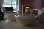 i forgot to take the leftover noodles my mother gave me for dinner, so ended up returning to the cafe close to 2:30, right when my bread was supposed to be ready. i figured a few extra minutes of baking couldn't hurt. maybe i left the food on purpose just so i'd get more riding time! i quickly grabbed my container from the cafe and returned home. i ran into the mailman, who noticed the smell when i opened my door. "oh, i'm baking bread," i told him. he said his wife used to make bread all the time, fancy ones like braided strands, but not anymore.