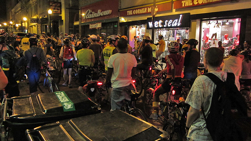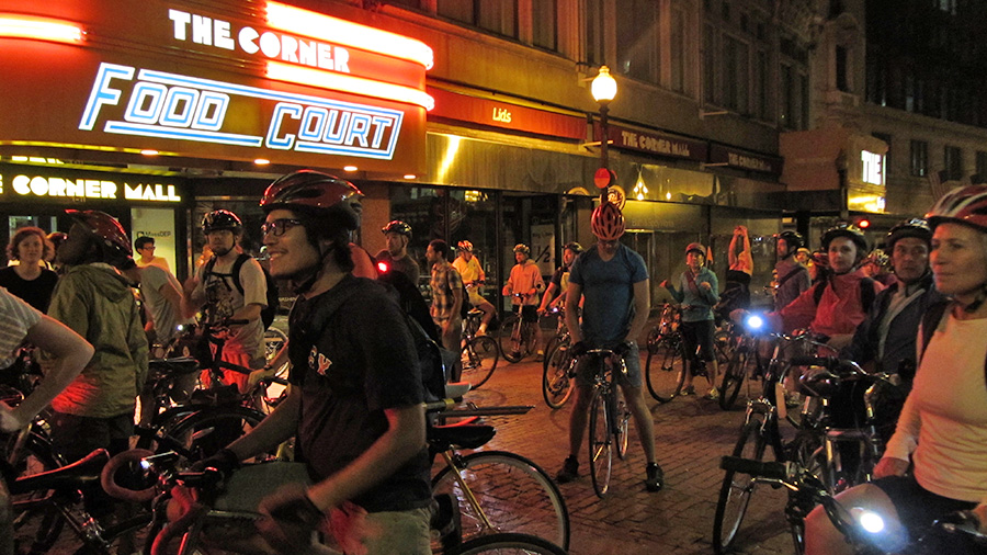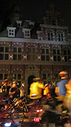 coolidge corner, allston center, and finally to harvard square. as the night wore on, people were cheering us on from the streets (some of them drunk no less). some places we went were dark, but was surprised to still people around. one person said to me that they were getting a contact high from all the pot smoke. by the time we got to harvard square around 3:00 the group had dwindled down to 100. the tour would continue until sunrise, where they'd go somewhere to watch the sun come up. next stop was to see the historical houses on brattle street, but i'd had enough by that point, and split off from the group to go home. definitely a cool thing to do. the architectural talks don't interest me as much as just riding bikes in such a large group.