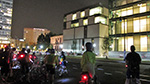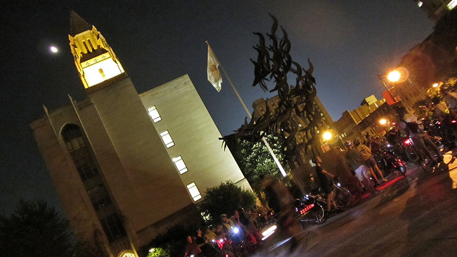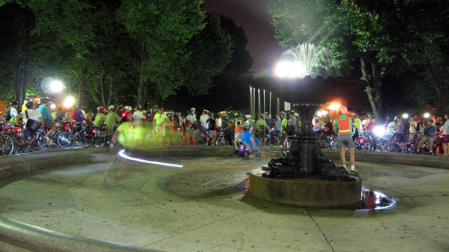 the tour kicked off a little bit after midnight, with 200+ riders descending onto the streets of boston, with blickers and reflectors and headlights. it felt like being in a parade. the convoy was so long that it took a few minutes for everyone to congregate at our first destination, the christian scientist reflecting pool. the guides gave some short talks, but i wasn't listening, too busy marveling at the spectacle.