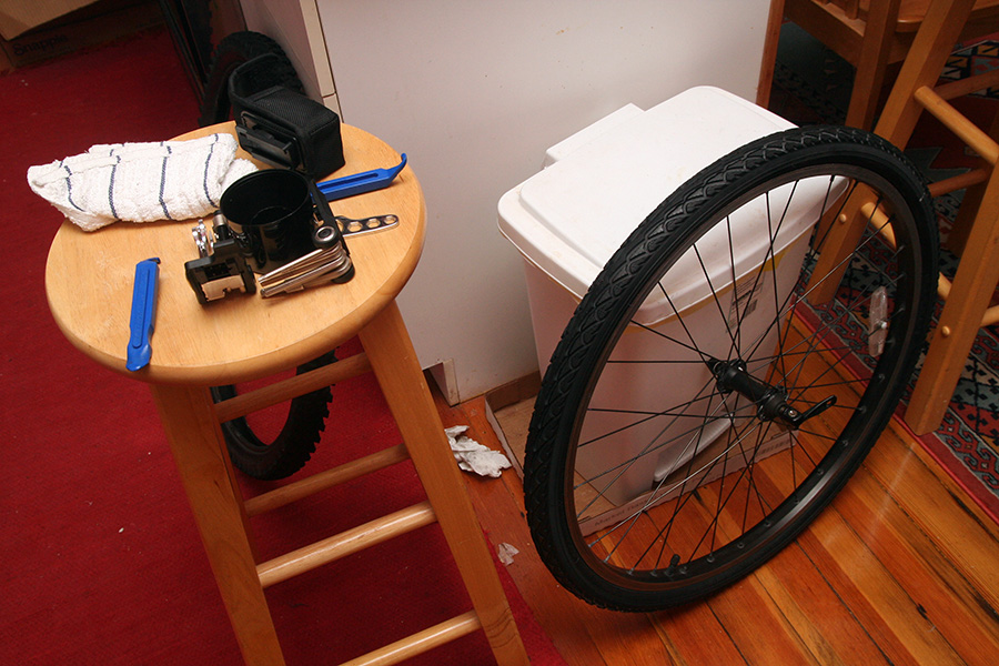 i wanted to replace the mountain bike tire on the front wheel of my trek 800 with the new one i got yesterday. i wheeled the bicycle to the back of the house so i could work on it. i was surprised when the motion-sensor lights turned on. i thought they were broken, i must've fixed it when i jiggled around the settings. parked upside down on my backyard porch, i removed in the front wheel and decided to work on it indoors.